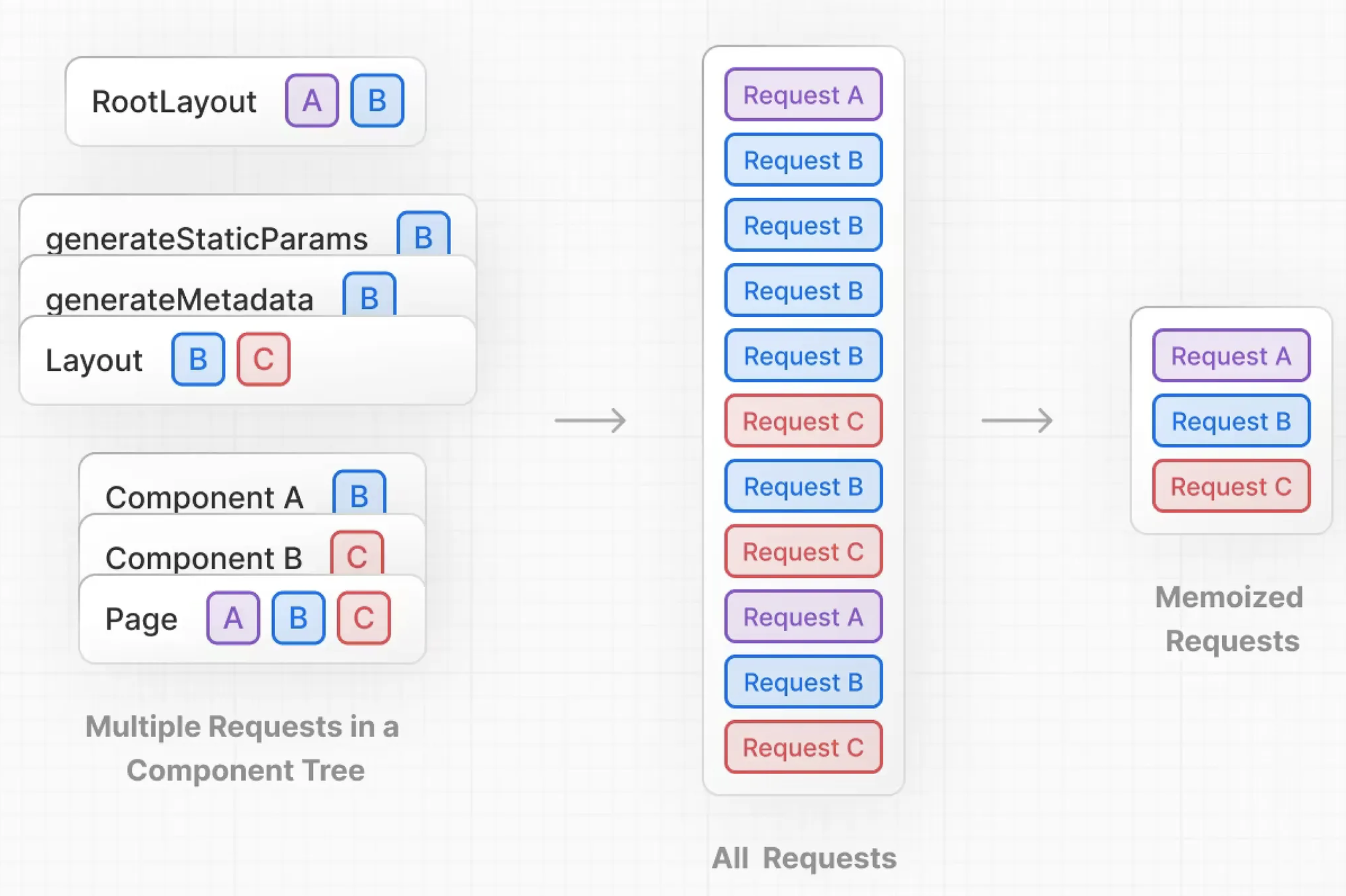 Next.js는 fetch API를 확장하여 동일한 URL과 옵션을 가진 요청을 자동으로 메모이제이션합니다. 즉, 같은 요청이 여러 번 호출되더라도 실제 네트워크 요청은 한 번만 실행됩니다.